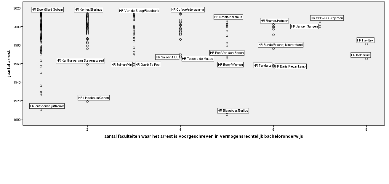 Als we ons die 400 arresten voorstellen als een piramide, waarbij de top bestaat uit ‘de meest geciteerde arresten’ – de door acht faculteiten voorgeschreven arresten – en de bodem uit de arresten die slechts door één faculteit worden voorgeschreven, dan kunnen we constateren dat slechts heel weinig arresten de top bereiken. Kennelijk produceert de Hoge Raad als ‘veelschrijver’ slechts enkele uitschieters die veel ‘verwijzingen’ opleveren; het gros wordt slechts door weinigen aangehaald en bereikt niet de top van de piramide. Oudere arresten die niet gesneuveld zijn op de overlevingstafel, maken grotere kans om op meer dan één faculteit te worden voorgeschreven dan jongere arresten (correlatie tussen leeftijd van het arrest en het aantal ‘citerende’ faculteiten; : R = – 0.194, n= 400, p<0.001). Ik zou dat een maat voor impact noemen: de blijvende waarde van een gerijpt arrest. piramide Wat vertelt ons dit nu? Ik noem een tweetal gedachten die bij mij opkomen. Allereerst: we associëren ‘autoriteit’ met anciënniteit: de oude arresten hebben blijvende impact, anders zouden ze niet (meer) voorgeschreven worden. Maar als meting uitwijst dat twee arresten van na 2010 er uit springen omdat zij nu al op vier faculteiten worden voorgeschreven (Lundiform en Intergamma), is dat dan niet ook een maat voor impact? arresten oud en nieuw In de tweede plaats:iedereen die iets weet van vermogensrecht zal begrijpen waarom Kelderluik en Haviltex zo belangrijk worden gevonden. De meting levert in dat opzicht dus een evidentie op. Maar misschien is de meting juist belangrijker om objectief inzichtelijk te maken dat arresten X, Y en Z niet door iedereen belangrijk worden gevonden. Sterker nog: elke faculteit heeft eigen ‘favorieten’. Er bestaat geen ‘landelijk overleg’ voor het voorschrijven van arresten en het bestaan van de top-tien van meest voorgeschreven arresten duidt dus op een kleine kern van gedeelde motieven voor het voorschrijven. Maar voor het merendeel van de gevallen hanteren we als docenten vanuit onze eigen ervaring en voorkeuren een eigen ‘beleid’ om arresten wel of niet voor te schrijven. En laten we wel wezen: één verwijzing is geen verwijzing…
